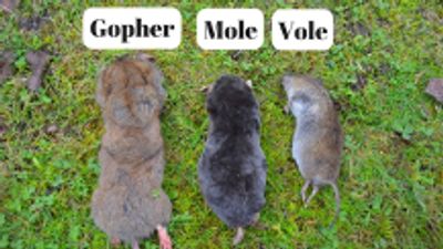 Pocket Gophers are herbivores and eat roots, plants, grass, trees & shrubs. They have light brown fur, large clawed front paws and four large incisor teeth. Gophers are about 30% larger than a mole and will dig tunnel systems deeper. Gopher mounds are crescent shaped and normally have a plug visible on one side. Gophers can move more than a ton of soil in a year and their tunnels can be very large causing significant soil erosion.